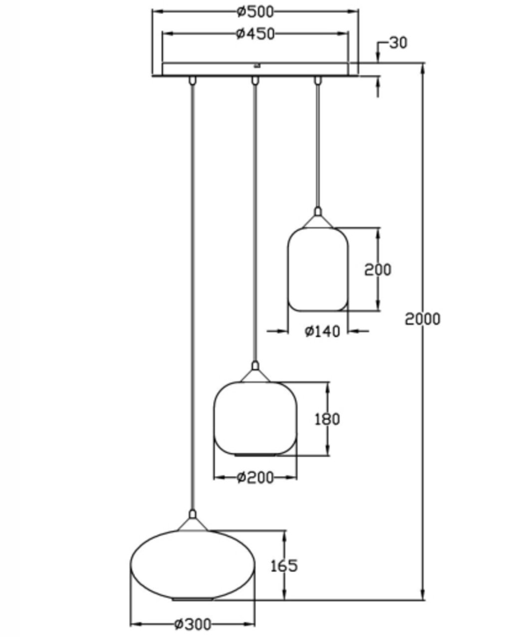 • Dimensions: H.200cm max Diam.diffuseurs 30cm + 20cm + 14cm