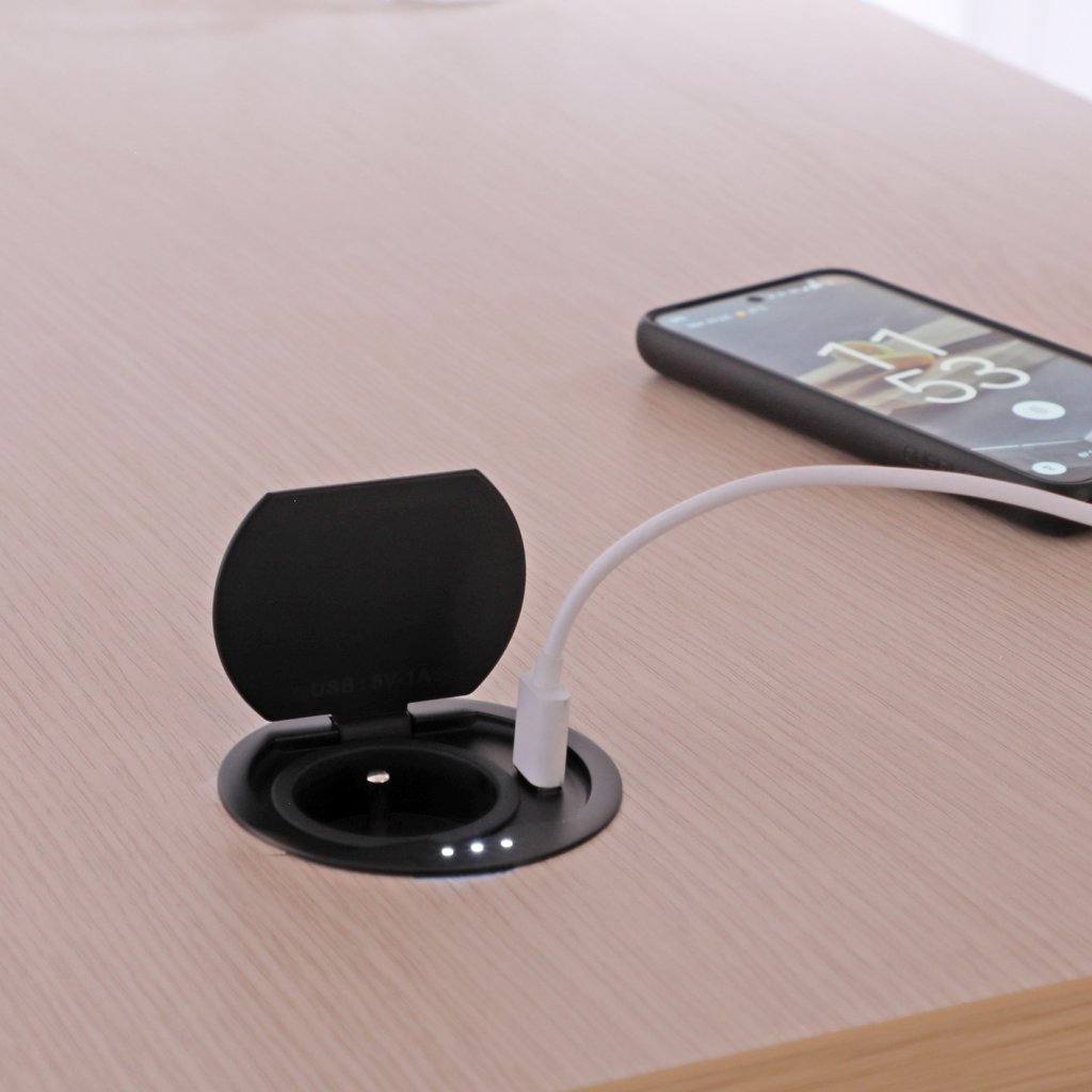 Bloc prise + USB (1A - 5V) affleurant DISC avec clapet à encastrer dans un plan de travail de 5 à 45mm - finition noir mat (RAL 9005) - 16A - 230V - 2P+T