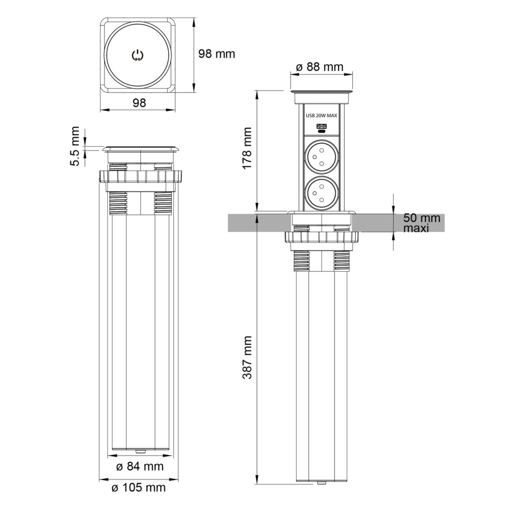 - Dimensions : H. visible 146 mm Ø. perçage 85 mm