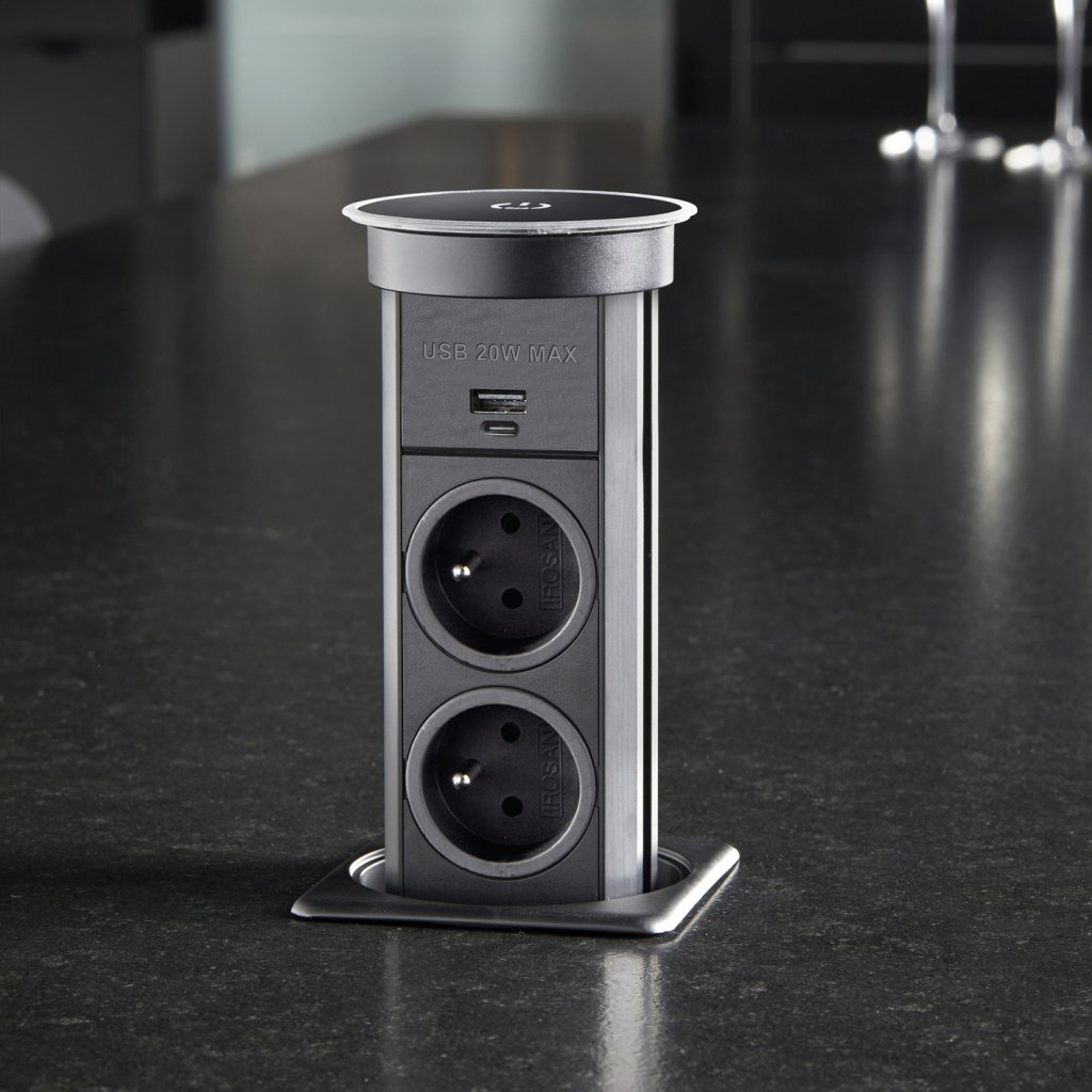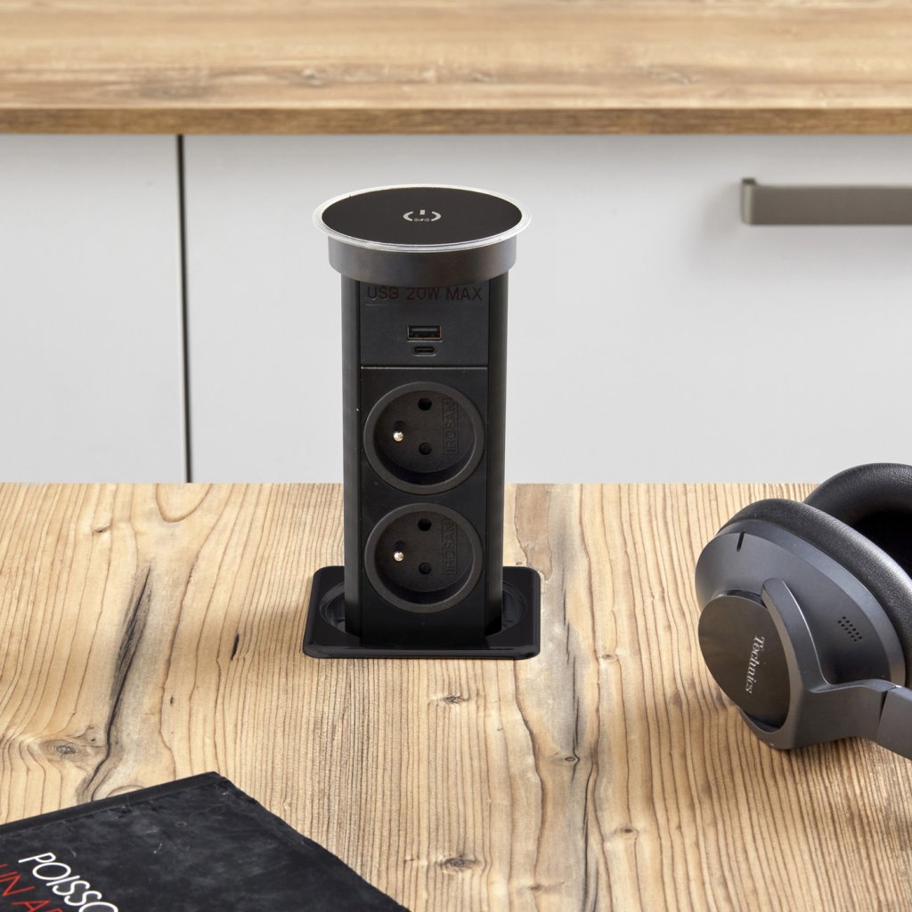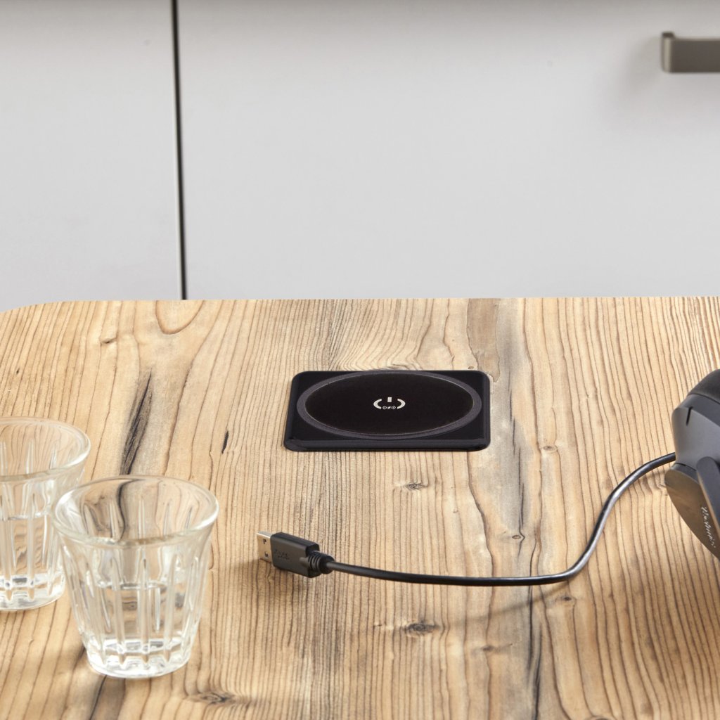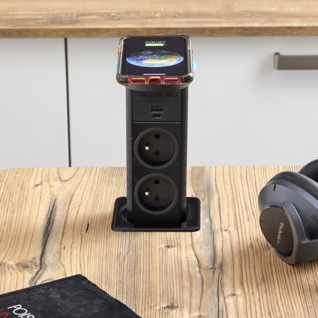 - Avec 2 ports USB de 5V (2A au total) pour charger les téléphones mobiles et les tablettes, et induction avec indicateur LED de charge.